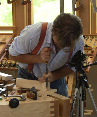 The topic was joinery, primarily mortise-and-tenon frame-and-panel doors, with half-blind dovetails and the famous "impossi-tail" rise dovetail. Virtually all of this information is bachelor in his books (and now DVDs as they come out). I know because I had brought all his books except his very latest (which I forgot) for him to sign, along with the first four DVDs to exist released.